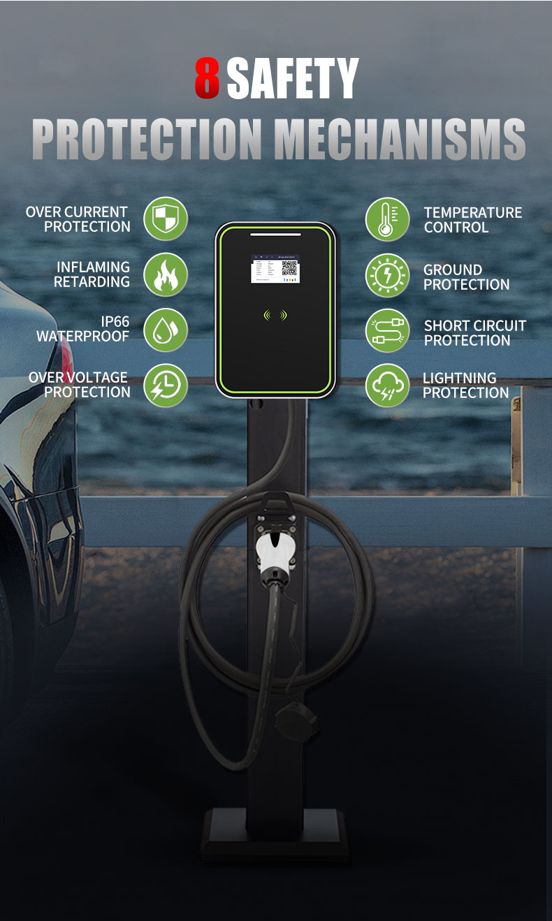 The APP& RFID Function EV Charger 32A GB/T 20234 380V,casing colours available in black and white, customised casing colours and charging string lengths available for larger orders. Compatible with GB/T 20234 , Designed with safety in mind, there are protection mechanisms forover-current,over-voltage andover-temperature problems, with a aggregate of 8 safety measures to cover the device and the auto during charging. The casing is made of ABS PC injection moulding and has a fire standing of UL94V_0. The factors of the main board are handed in well- known manufacturers, with dependable quality. The main control MCU is characterised by low power consumption, high performance and high integration. The operating temperature covers-40 °C-85 °C, which can meet the harsh working terrain.The EV charging string is made of high chastity bobby with excellent electrical conductivity, slow heating of the captain during high current charging and long operating time. The external cover is made of high quality cable, which is resistant to erosion and low temperatures, so that the charging string won’t harden due to low temperatures and help the device from working duly. Easy to install, it’s recommended to use hard wiring for the input power string. The installation height of the charging device is about1.5 M from the ground. a hook is included to store the ev charging string.