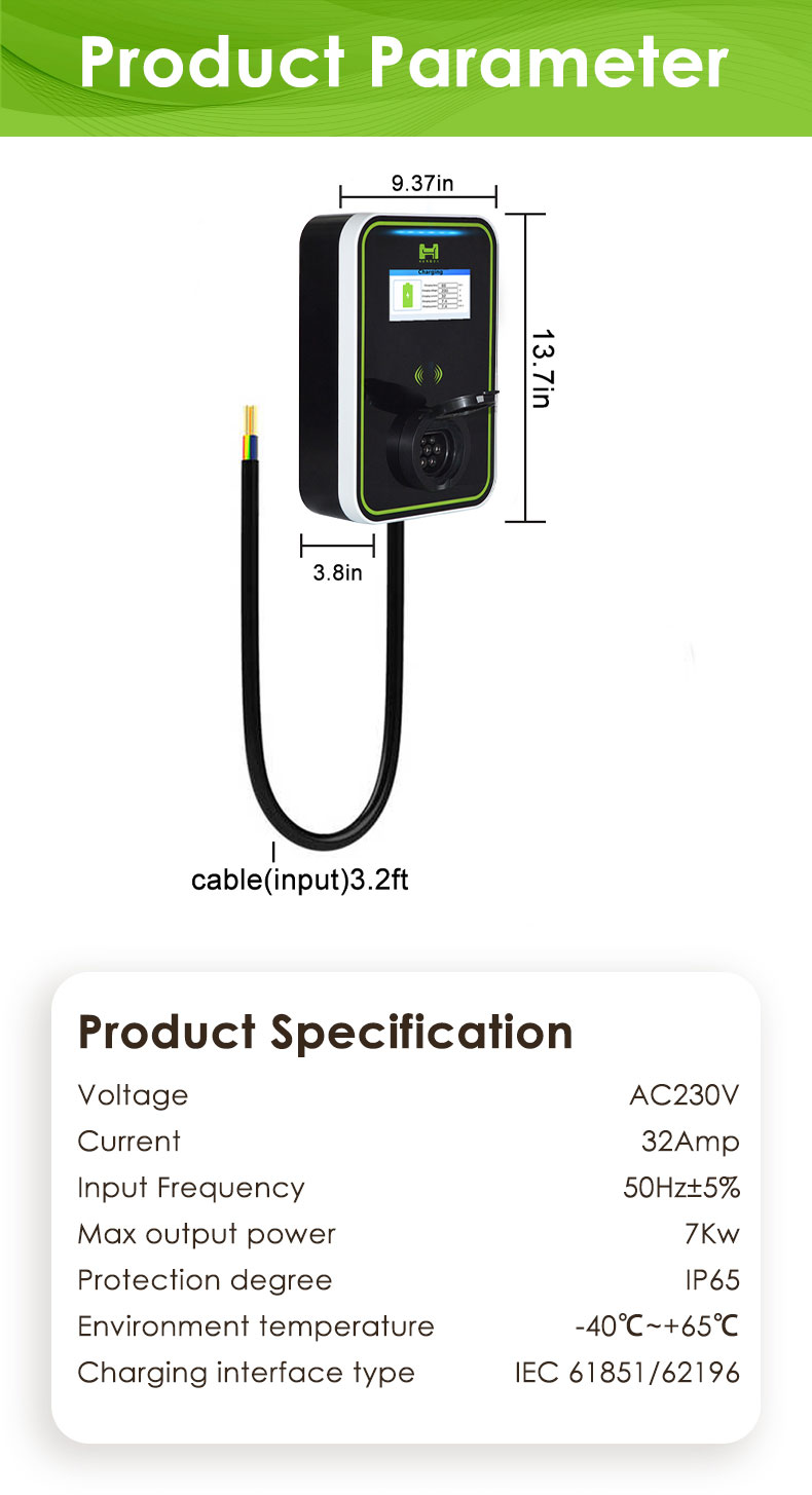 HENGYI EV Charger 32A EVSE Wallbox Electric Vehicle Car Charging Station 220V Type 2 Socket 1 Phase 7KW IEC 62196-2
